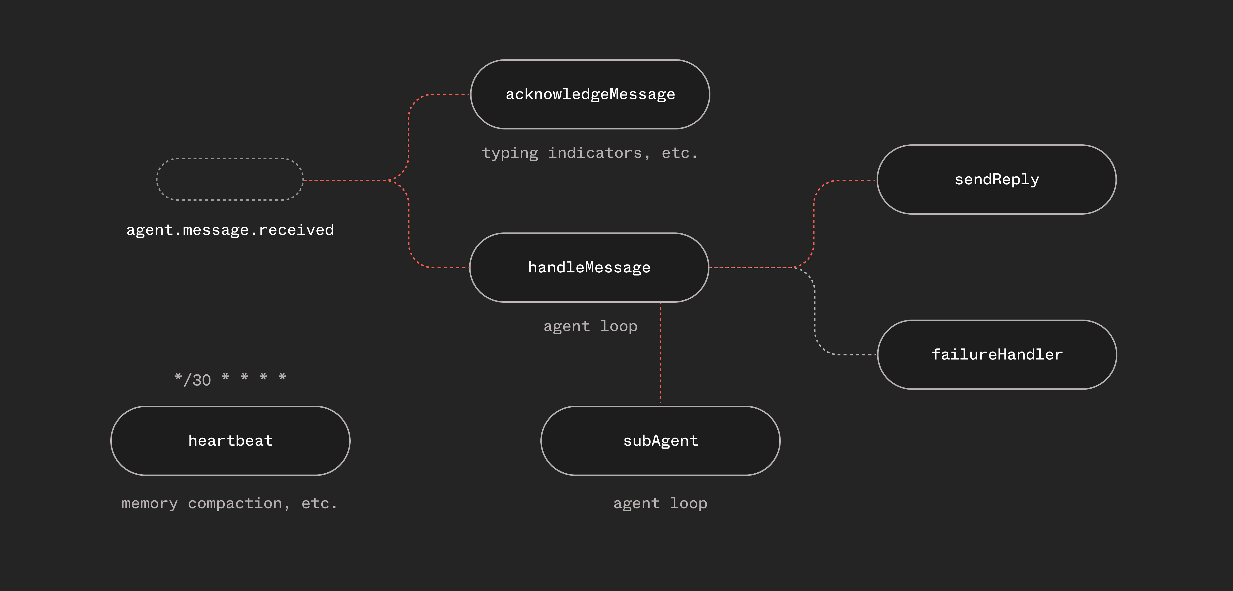 This separation matters. The typing indicator fires immediately when a message arrives — it doesn't wait for the agent loop. The reply function handles Telegram/Slack-specific formatting and error handling (like falling back to plain text when the LLM generates malformed HTML). The failure handler catches unhandled errors across all functions and notifies the user.